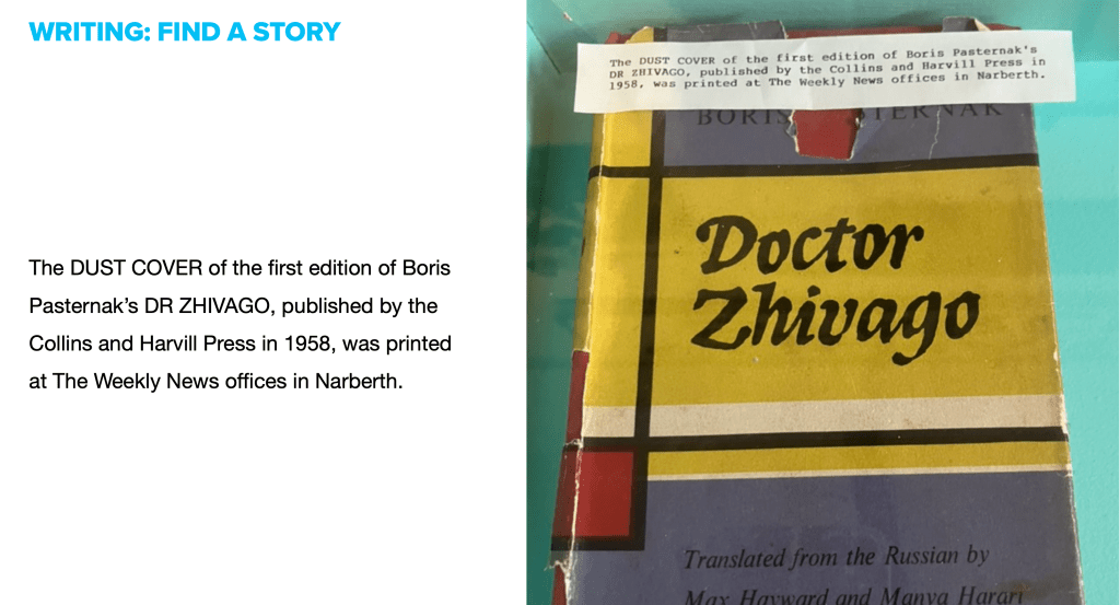It’s hard to imagine a better setting than a bookshop in a museum for our most recent writing workshop on local stories. Lorna has done some fascinating research into the history of printing in Narberth, resulting in this discovery about Boris Pasternak’s first edition of ‘Doctor Zhivago’. And this broadened out into a discussion of labels in museums, and the stories they tell.