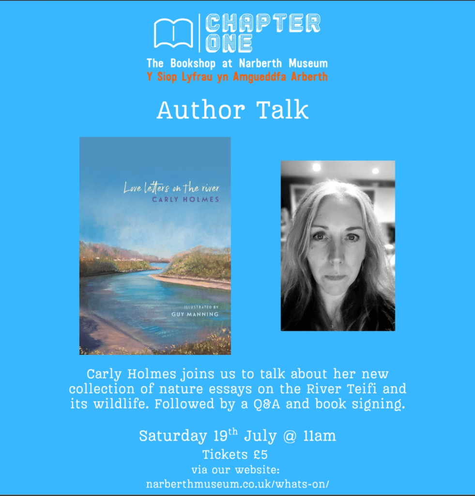 We’re delighted to welcome Carly Holmes to Chapter One in July to talk about her new book, Love Letters on the River, a collection of essays on the River Teifi and its wildlife, beautifully illustrated by Tenby artist Guy Manning and published by Parthian Books on 10th July.